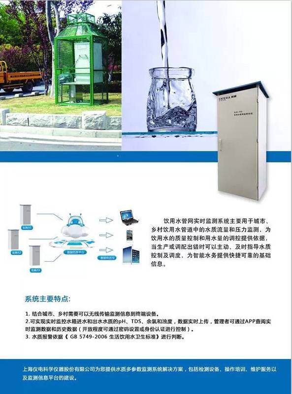 飲用水安全關(guān)乎民生安全,新標(biāo)準(zhǔn)的實施對于提高廣大人民群眾的身體健康素質(zhì)具有重要意義。儀電科儀根據(jù)新國標(biāo)(GB5749-2006)以及自來水管網(wǎng)輸送的特點(diǎn),設(shè)計了兩款新品“SJG-702型智能多參數(shù)水質(zhì)監(jiān)測系統(tǒng)”和“SJG-703型智能管網(wǎng)飲用水質(zhì)多參數(shù)監(jiān)測系統(tǒng)”。這兩款智能監(jiān)測系統(tǒng)運(yùn)用水質(zhì)在線分析儀、自動控制技術(shù)、計算機(jī)技術(shù)并配以專業(yè)軟件,組成一個從取樣、預(yù)處理、分析到數(shù)據(jù)處理及存貯的完整系統(tǒng),從而實現(xiàn)對自來水的在線自動監(jiān)測。既滿足了監(jiān)測項目多參數(shù)合并為一體,又滿足了維護(hù)量小,并且達(dá)到市電和太陽能供電任意選擇的要求,機(jī)箱防護(hù)等級為 IP65,可防止水的噴淋及灰塵的侵入。