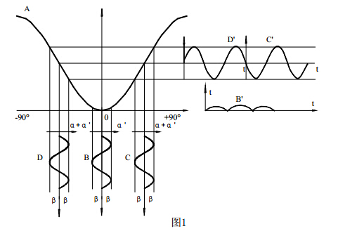 法拉弟線圈兩端加以頻率為 f 的正弦交變電壓 u=Usin2πft 時,按照法拉弟磁光效應(yīng),通過的平面偏振光振動平面將迭加一個附加轉(zhuǎn)動角度: α1=β·sin2πft 在起偏器與檢偏器之間當(dāng)有法拉弟線圈時出射檢偏器光強信號如下: