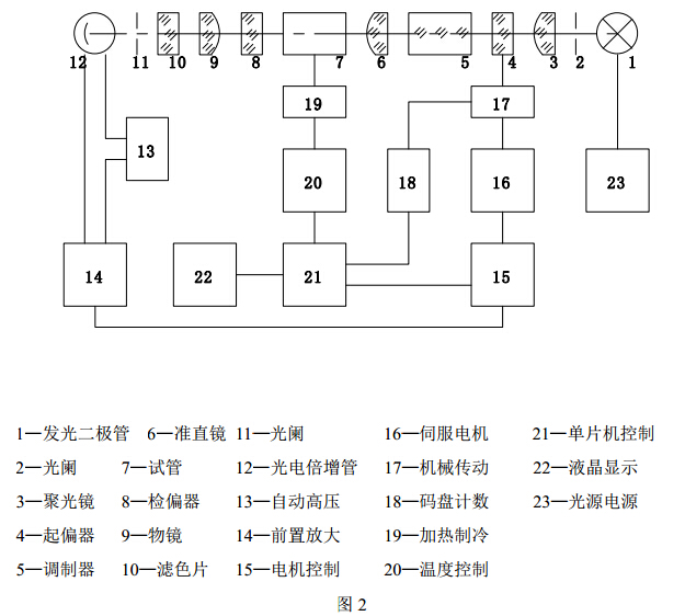 圖2是儀器的結(jié)構(gòu)框圖。發(fā)光二極管發(fā)出的光依次通過光闌、聚光鏡、起偏器、法拉第調(diào)制器、準(zhǔn)直鏡。形成一束振動面隨法拉第線圈中交變電壓而變化的準(zhǔn)直的平面偏振光,經(jīng)過裝有待測溶液的試管后射入檢偏器,再經(jīng)過接收物鏡、濾色片、光闌、波長為 589.3nm 的單色光進(jìn)入光電倍增管,光電倍增管將光強信號轉(zhuǎn)變成電訊號,并經(jīng)前置放大器放大。自動高壓是按照入射到光電倍增管的光強自動改變光電倍增管的高壓,以適應(yīng)測量透過率較低的深色樣品的需要。若檢偏器相對于射入的偏振光平面偏離正交位置,則通過頻率為 f 的交變光強信號,經(jīng)光電倍增管轉(zhuǎn)換成頻率 f 的電信號,此電信號經(jīng)過前置放大后輸入電機控制部分,再