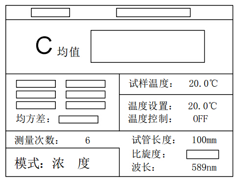 c) 測濃度時,模式選 3,測量內(nèi)容顯示濃度,數(shù)據(jù)欄顯示 C 及 C 均值,需要輸入試管長度、比旋度及測量的次數(shù),若比旋度為負(fù)請輸入負(fù)值。