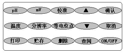 儀器共有15個(gè)操作鍵,分別為:ON/OFF、pH、mV、溫度、校準(zhǔn)、等電位點(diǎn)、分辨率、打印、貯存、刪除、查閱、▲、▼、確認(rèn)和取消。