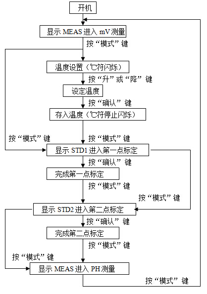 mV測量(顯示MEAS和 mV) 溫度設置(顯示℃閃爍) pH標定1(顯示STD1) pH標定2(顯示STD2) pH測量(顯示MEAS和 pH);