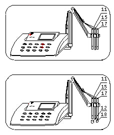 b) 將6801A型 pNa玻璃電極(11)、6802A甘汞電極(17)和T-818-B-6溫度傳感器(15)夾在多功能電極架(10)上。
