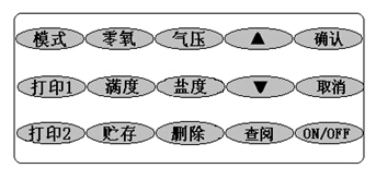 儀器共有15個(gè)操作鍵,分別為:ON/OFF、模式、零氧、滿度、氣壓、鹽度、打印1、打印2、貯存、刪除、查閱、、、確認(rèn)和取消。