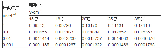 我國的電導(dǎo)率基準(zhǔn)是用相對法建立起來的,它建立于國際公認(rèn)值的基礎(chǔ)上,、以標(biāo)準(zhǔn)物質(zhì)為實(shí)物依據(jù)。1989年國家技術(shù)監(jiān)督局發(fā)布了四種氯化鉀溶液在五個(gè)溫度下的電導(dǎo)率值,見下表: