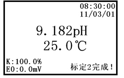 此時(shí),按“取消”鍵,則儀器返回相應(yīng)的工作狀態(tài)。若按“標(biāo)定”鍵,儀器即進(jìn)入“標(biāo)定2”工作狀態(tài)。若儀器顯示屏左上方顯示“E0或K值超差!”,說(shuō)明電極有可能損壞,提醒用戶(hù)需更換電極。