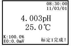 當(dāng)儀器顯示屏左上方顯示“重新標(biāo)定!”,說(shuō)明電極標(biāo)定時(shí)間已超過(guò)了用戶(hù)設(shè)置的標(biāo)定間隔時(shí)間,提醒用戶(hù)需對(duì)電極系統(tǒng)進(jìn)行重新標(biāo)定。