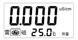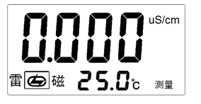 經(jīng)過(guò)上述4.3~4.4的設(shè)置,儀器可用來(lái)測(cè)量被測(cè)溶液,按“電導(dǎo)率/TDS”鍵,使儀器進(jìn)入電導(dǎo)率測(cè)量狀態(tài)。儀器顯示如圖: