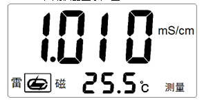 如果儀器沒(méi)有接上溫度電極,則用溫度計(jì)測(cè)出被測(cè)溶液的溫度,按“4.3 溫度設(shè)置”操作步驟進(jìn)行溫度設(shè)置;然后,儀器接上電導(dǎo)電極,用蒸餾水清洗電極頭部,再用被測(cè)溶液清洗一次,將電導(dǎo)電極浸入被測(cè)溶液中,用玻璃棒攪拌溶液使溶液均勻,在顯示屏上讀取溶液的電導(dǎo)率值。如溶液溫度為25.5℃,電導(dǎo)率值為1.010mS/cm,則儀器顯示如圖: