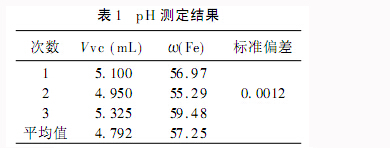 計算批pH最小時Vc的體積,Vc的數(shù)值可在電腦存儲的數(shù)據(jù)中直接讀出,然后按照ω(Fe)=2Vvc-Cvc×10-3×MFe/m樣×100計算鐵含量。按此法計算其他兩次的數(shù)值。將結(jié)果填入表一中,計算標準偏差和平均值。