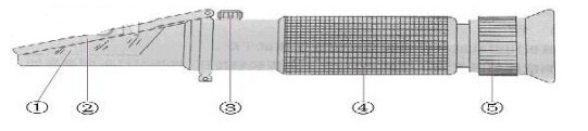 • 折光棱鏡 ②、蓋板 ③、校準(zhǔn)螺栓④、光學(xué)系統(tǒng)管路 ⑤、目鏡(視度調(diào)節(jié)環(huán))