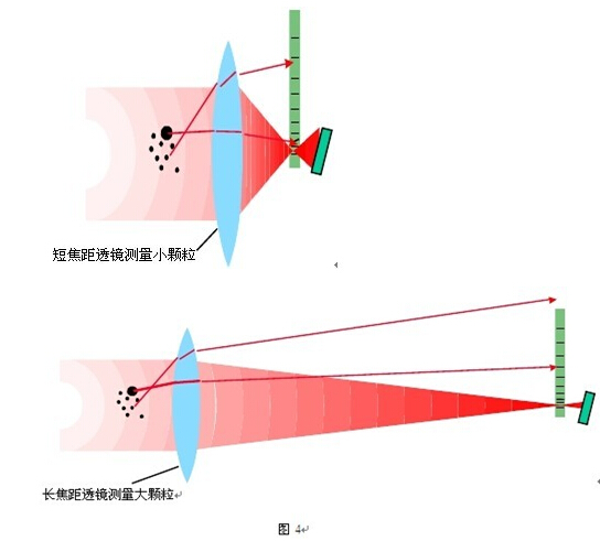 多透鏡系統(tǒng)曾在二十世紀(jì)八十年代前被廣泛采用,它使用傅里葉光路配置即樣品池放在聚焦透鏡的前方,配有多個(gè)不同焦距的透鏡以適應(yīng)不同的粒徑范圍,如圖 4 所示,優(yōu)點(diǎn)是設(shè)計(jì)簡(jiǎn)單,只需要分布于幾十度范圍的焦平面檢測(cè)器,成本較低。缺點(diǎn)是如果樣品粒徑范圍寬的時(shí)候需要更換透鏡,不同透鏡的結(jié)果需要拼合,對(duì)一些未知粒徑的樣品用一個(gè)透鏡測(cè)量時(shí)可能會(huì)丟失信號(hào)或?qū)τ谟捎诠に囎兓瘜?dǎo)致的樣品粒徑變化不能及時(shí)反映。