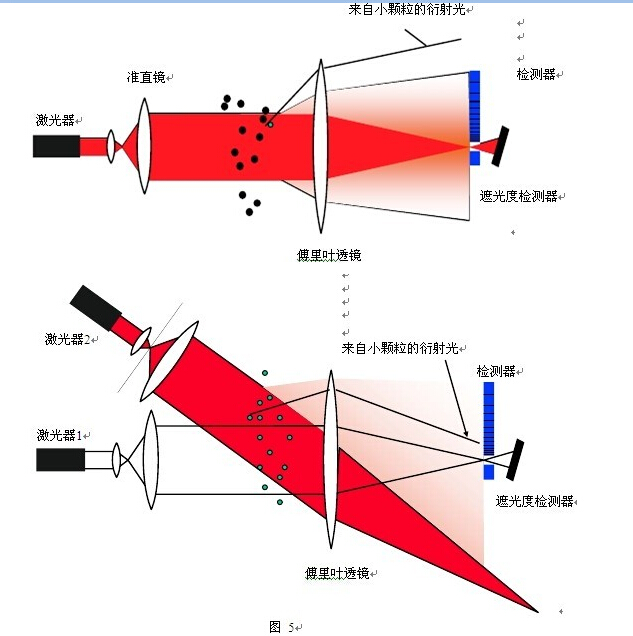 多光源技術(shù)也是采用傅里葉光路配置即樣品池在聚焦透鏡的前方,一般只有分布于幾十度角度范圍的檢測(cè)器,為了增大相對(duì)的檢測(cè)角度,使該檢測(cè)器能夠接收到小顆粒的衍射光信號(hào),在相對(duì)于第一光源光軸的不同角度上再配置第一或第二激光器,如圖 5 所示。這種技術(shù)的優(yōu)點(diǎn)是只需分布于幾十度角度范圍的檢測(cè)器,成本較低,測(cè)量范圍特別是上限可以比較寬,缺點(diǎn)是分布于小角度范圍的小面積檢測(cè)器同時(shí)也被用于小顆粒測(cè)量,由于小顆粒的衍射光在單位面積上的信號(hào)弱,導(dǎo)致小顆粒檢測(cè)時(shí)的信噪比降低,這就是為什么多光源系統(tǒng)在測(cè)量范圍上限超過(guò) 1500 微米左右時(shí),若要同時(shí)保證幾微米以下小顆粒的準(zhǔn)確測(cè)量,需要更換短焦距的聚焦透鏡。另外,多透鏡系統(tǒng)在測(cè)量樣品時(shí),不同的激光器是依次開(kāi)啟,而在干法測(cè)量時(shí),由于顆粒只能一次性通過(guò)樣品池,只有一個(gè)光源能被用于測(cè)量,所以一般采用多透鏡技術(shù)的干法測(cè)量的粒徑下限很難低于 250 納米。