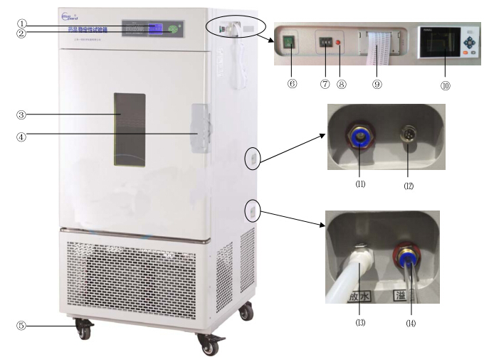 ① 控制器 ② 操作鍵③ 觀察窗 ④ 門把手⑤ 腳輪 ⑥ 電源開關(guān)