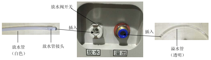 水管(白色)與放水管接頭連接,并將其插入放水口(聽到“咔”聲為卡到位),待水流出后再關(guān)閉放水閥(將放水閥開關(guān)按下,放水管及接頭彈出)。第一次開機(jī)使用時(shí),為保證工作室內(nèi)加濕水槽不因氣堵而順利自動(dòng)進(jìn)水,請將放水管(白色)與放水管接頭連接,并將其插入放水口(聽到“咔”聲為卡到位),待水流出后再關(guān)閉放水閥(將放水閥開關(guān)按下,放水管及接頭彈出)。溢出口處插入溢水管(透明),并放盛水盤或用水溝方式排水。