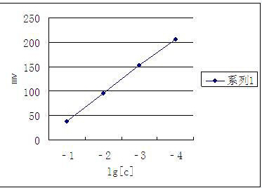 則可得到公式:E=klg[c]+b,其中E為所測(cè)電位,K為直線的斜率,C為離子濃度,b為直線在Y軸上的截距。根據(jù)實(shí)驗(yàn)數(shù)據(jù),計(jì)算出k=-57,b=-17.5,代入原公式得:E=-57lg[c]-17.5。