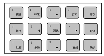 儀器面板上共有15個操作鍵,分別為:貯存/1、刪除/2、6/3、切換/4、3/5、測試/6、測量/7、標定/8、5/9、打印/0、4/.、查閱、確認、取消、修改。除了“查閱”、“確認”、“取消”、“修改”四個鍵是單功能以外,其他的鍵都是復(fù)用的,它們有兩種功能,即既有功能鍵又有數(shù)字鍵的作用,平時它們作為功能鍵,按這些鍵可以完成相應(yīng)的功能;而第二功能即為數(shù)字鍵,當且僅當需要輸入數(shù)據(jù)時,這些鍵作為數(shù)字鍵。如“測量/7”鍵,平時按此鍵,可以在儀器的起始狀態(tài)下進入測量狀態(tài);在輸入數(shù)字時,按此鍵,將輸入數(shù)字“7”。