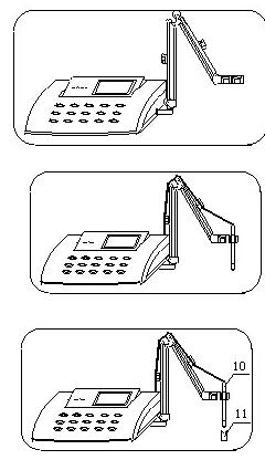 b) 溶解氧電極(10)夾在多功能電極架(9)上。