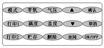 儀器共有15個操作鍵,分別為:ON/OFF、模式、零氧、滿度、氣壓、鹽度、打印1、打印2、貯存、刪除、查閱、確認和取消。