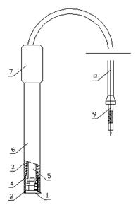 組裝時,用鑷子將專性透氣薄膜(1) 放于電極外殼前帽(4)的內(nèi)腔底部,將硅橡膠墊圈(2)套在電極外殼主管(6)的頂端,然后將電極外殼前帽緊緊旋在外殼主管上,使專性透氣薄膜緊夾在墊圈與前帽內(nèi)腔底之間并絕不滲水,將已配制好的內(nèi)溶液緩緩注入電極外殼腔體內(nèi),約注滿2/3容積即可。然后把內(nèi)電極(5)輕輕放進電極外殼中,使內(nèi)電極的平面敏感玻璃膜接觸到透氣膜,將電極外殼后帽(7)旋于外殼主管后部。當(dāng)外殼后帽旋到與主管外螺紋時,應(yīng)拉住電級導(dǎo)線(8)將內(nèi)電極輕輕上下拉動數(shù)次,以使內(nèi)溶液中余留的氣泡上升至內(nèi)溶液的上部,然后向下旋緊外殼后帽,使內(nèi)電極的平面敏感玻璃能緊貼專性透氣膜,由此而使內(nèi)電極的平面敏感玻璃與專性透氣膜間的內(nèi)溶液能形成一極薄的液層。最后將組裝完畢的電極頭部向下,垂直或略有傾斜地固定在支架上,等待測試。