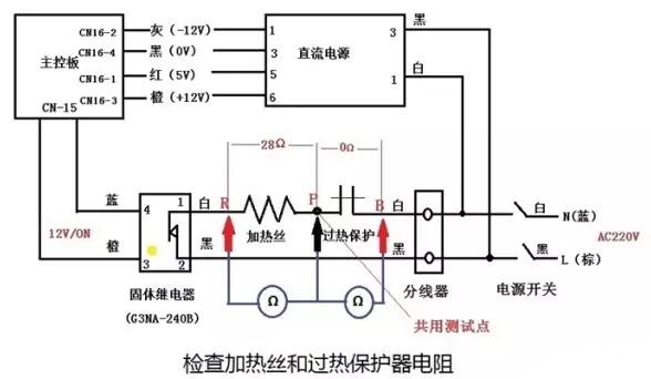 如果加熱電路有電壓,這時(shí)候就需要關(guān)閉電源,用萬(wàn)用表的電阻檔,按照?qǐng)D3所示,分別檢查加熱絲(R,P兩端)和過(guò)熱保護(hù)器(B,P兩端)的電阻是否為28 歐姆和0 歐姆。一般情況下,最大的原因是加熱絲斷路了,R-P兩端的電阻無(wú)限大。