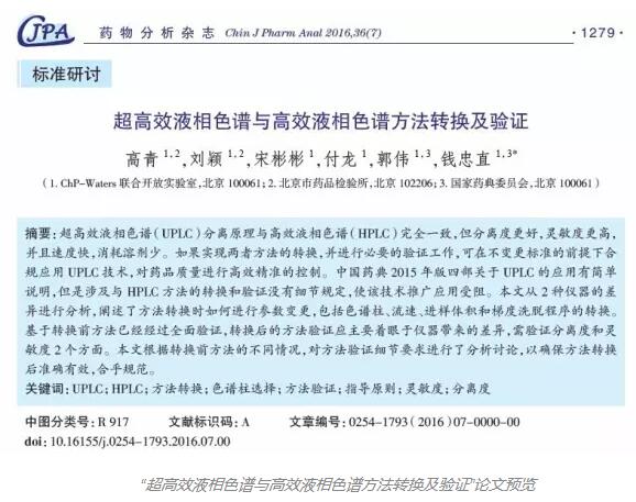 針對這一熱點問題,中國藥典-沃特世聯(lián)合實驗室撰寫了“超高效液相色譜與高效液相色譜方法轉(zhuǎn)換及驗證”文章,近期發(fā)表于《藥物分析雜志》(2016年第7期)。文中闡述了HPLC方法向UPLC方法如何進行轉(zhuǎn)換,以及轉(zhuǎn)換后需要進行哪些關(guān)鍵的驗證項目。