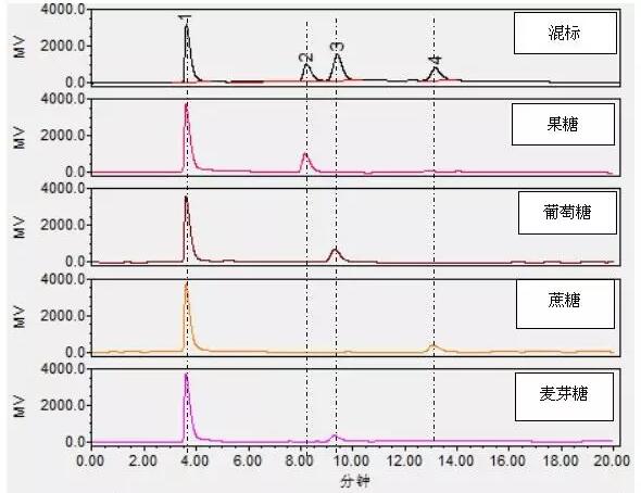 上述測試過程中使用的是4種糖的混合標準溶液,每個峰對應的待測組分還是未知的,因此在該儀器分析條件下先對各組分進行單標確認。
