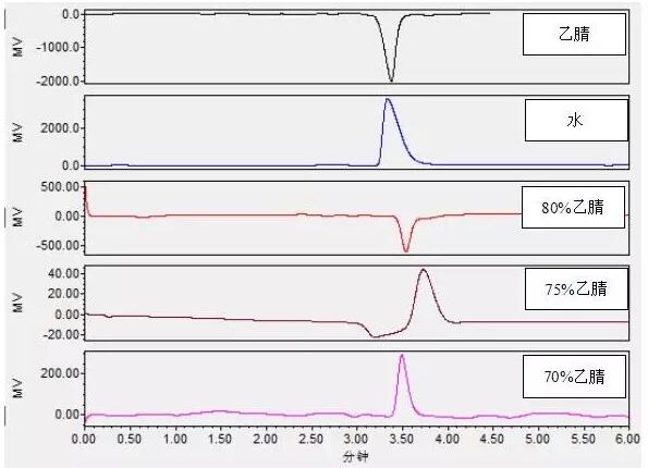 從圖中可以看出,試樣為70%乙腈和80%乙腈時溶劑峰已經(jīng)變小許多,而以流動相為樣品(75%乙腈)時溶劑效應得到了進一步的降低,也就是人們常說的,可以嘗試用流動相配制標準溶液或者定容樣品減輕溶劑效應。