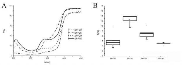 例如:SPF15與SPF20防曬品在UVB波段(270~320 nm)的透射光譜幾乎重合,但是在UVA波段,SPF15的樣品透射率較低,說明其對紫外線的遮擋作用明顯弱于SPF20防曬品。