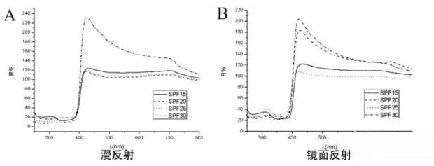 取適量防曬化妝品均勻涂抹于硅膠墊上,樣品置于積分球漫反射和鏡面反射位置分別測量防曬化妝品的反射率,掃描波長范圍:190~800 nm,掃描速度:中,狹縫寬度:8nm,空白硅膠墊為空白板。