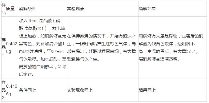 1.濕法消解,加入混合酸10mL進行消解,消解過程比較耗時,產(chǎn)生大量紅棕色氣體,爆沸較嚴重,難于控制;消解液有少量懸浮物,消解效果還不錯。