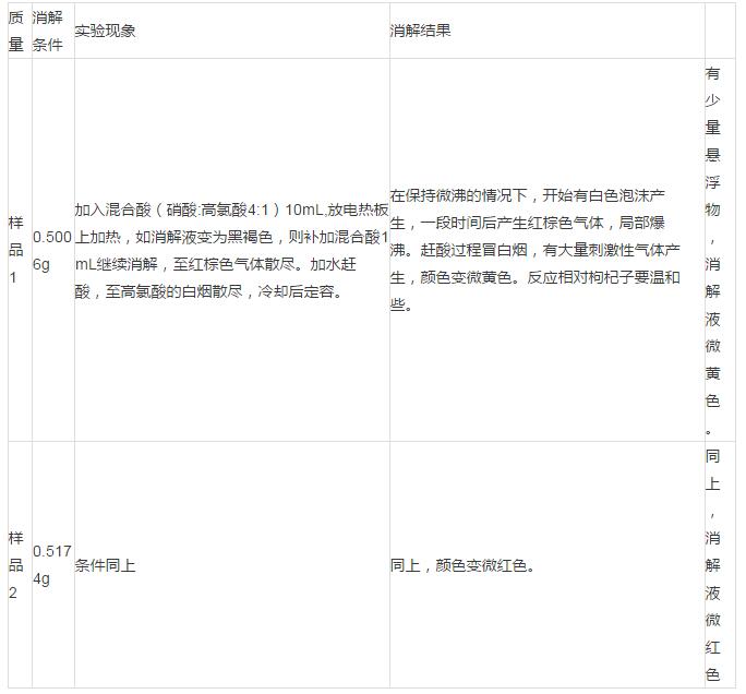 1.濕法消解,加入混合酸10mL進行消解,消解過程相當耗時,并且難于控制。消解過程中消解液很容易變?yōu)楹诤稚�,需要補加混合酸,得到的消解液有少量懸浮物,呈微黃色或微紅色。