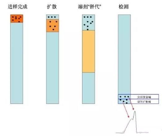 圖5.溶劑造成的峰擴(kuò)散和峰分叉過(guò)程。橘黃色為溶劑,黑色為分析化合物,淡藍(lán)色為色譜