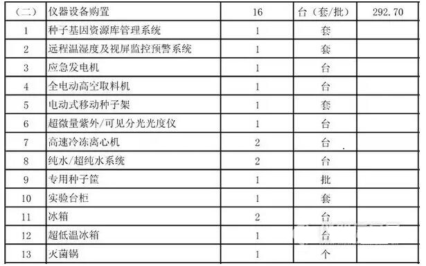 項目建設地點位于海南省儋州市寶島新村,主要建設內容為新建中期種子備份庫1224平方米,道路與場地硬化950平方米,以及照明、給排水、消防等配套室內外工程;購置儀器設備16臺(套/批)�?偼顿Y966萬元,全部為中央預算內投資。項目建設期為2年。