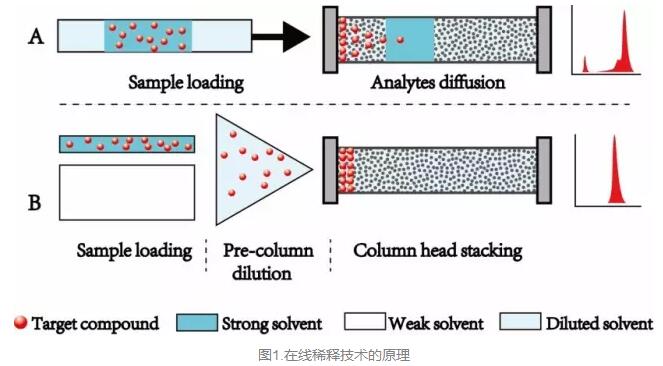 在線稀釋技術(shù)將強(qiáng)溶劑與高比例的弱溶劑通過高效混合器瞬間稀釋成一個(gè)90-95%的弱溶劑,再注入到色譜柱,因?yàn)槿跞軇o法推動(dòng)目標(biāo)物往前移動(dòng),此時(shí)目標(biāo)物將在柱頭聚焦,待目標(biāo)物全部聚焦在柱頭,再提高強(qiáng)溶劑比例,使分析物分離得到尖銳對(duì)稱的色譜峰。