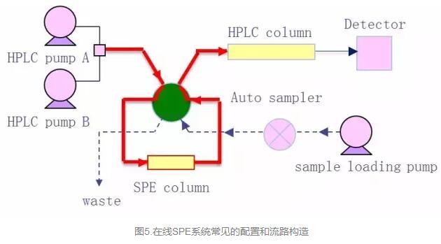 大體積進(jìn)樣量有可能會(huì)帶來一個(gè)問題,即基質(zhì)雜質(zhì)增加,影響定量準(zhǔn)確度。固相萃取SPE是一種有效的樣品富集和除雜手段,廣泛應(yīng)用于食品、環(huán)境或生物樣品的前處理。但手工操作的離線SPE存在操作繁瑣復(fù)雜、耗時(shí)、重現(xiàn)性差等缺點(diǎn),而在線SPE-HPLC可以部分解決以上問題。